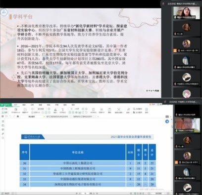 In the fourth item of the meeting, Li Ruihan introduced the basic information of the College of Chemistry and Materials Science of Jinan University. She first introduced the majors and discipline platforms of the college. Next, she introduced the employment platform, corporate internships, career planning activities, employment forums and other related information for students of the college in the past five years.