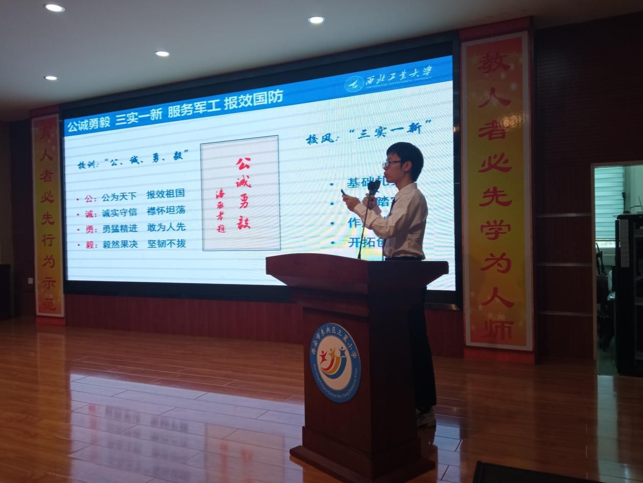 随后,朱萌以《我心中的西北工业大学》为题进行宣讲,生动形象地讲述军机设计师们背后的故事,向同学们展现出西北工业大学“公诚勇毅”的校训和“三实一新”的校风。