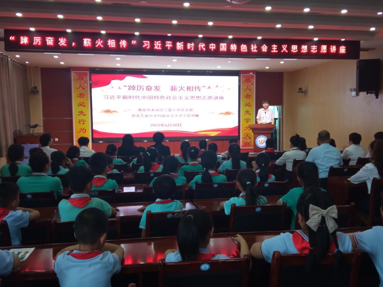 2023年6月30日上午,williamhill中文官网师生融合第三党支部书记黄拳章、支部教工党员宋佳音、员工预备党员夏晨赫、陶沐佳,发展对象朱萌及工大青年宣讲团甘肃等赴西安市未央区三星小学开展校园宣讲暨爱国主义教育活动。西安市未央区三星小学党支部书记刘春利与全体党、团员教师和40多位少先队员代表共同参与本次活动。活动由宋佳音主持。